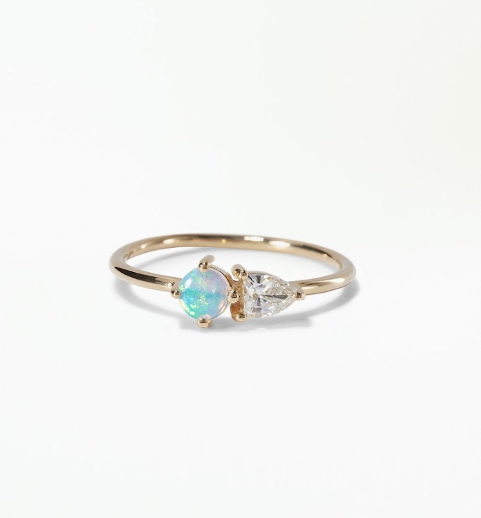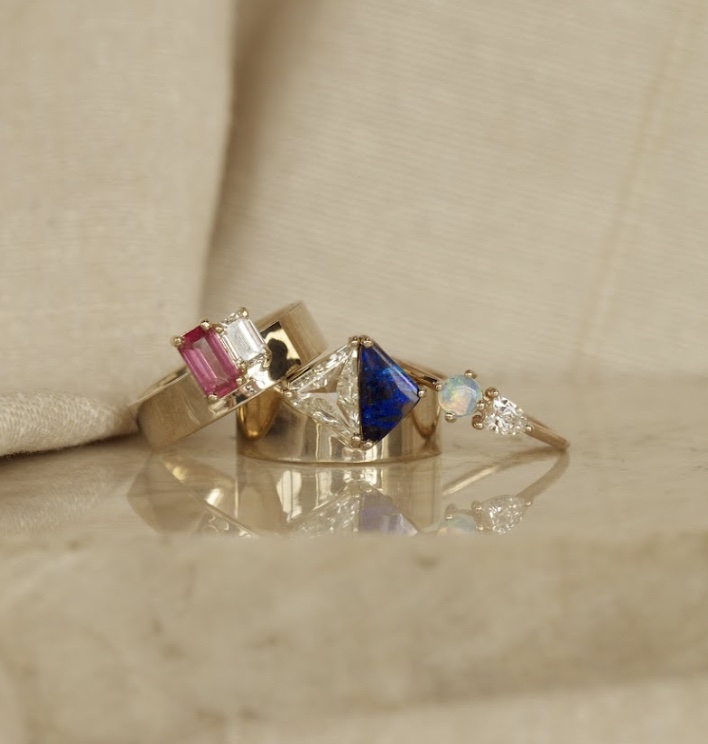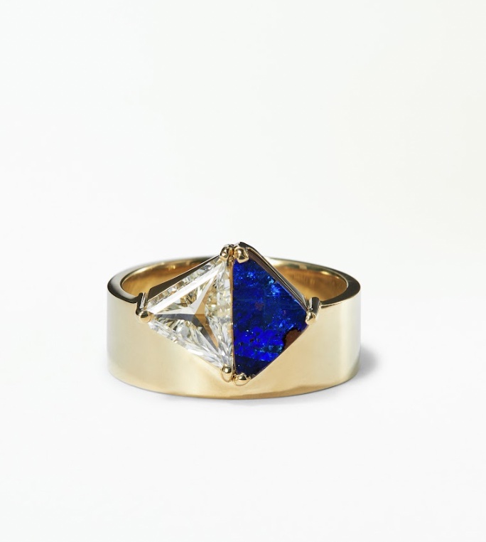 ONE OF A KIND BRICOLAGE RING NO. 8 Designed with stones we’ve collected over time, the Bricolage rings merge eclectic shapes and sizes, into a single monumental piece. A triangular cut diamond and opal mirror each other on a thick gold band.
