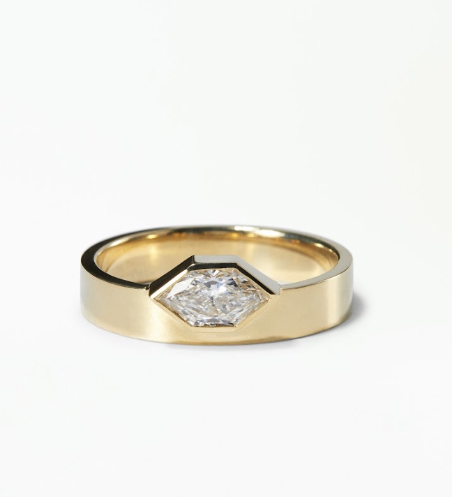 ONE OF A KIND ELONGATED HEX CUT DIAMOND MONOLITH RING A one-of-a-kind monolith featuring a Hex Cut Diamond, set atop a thick gold band.
