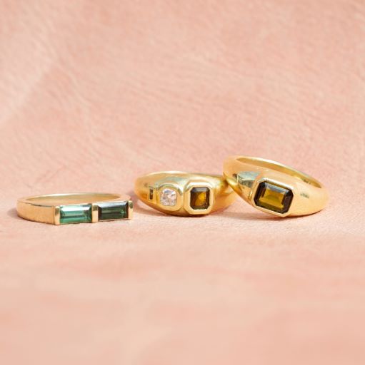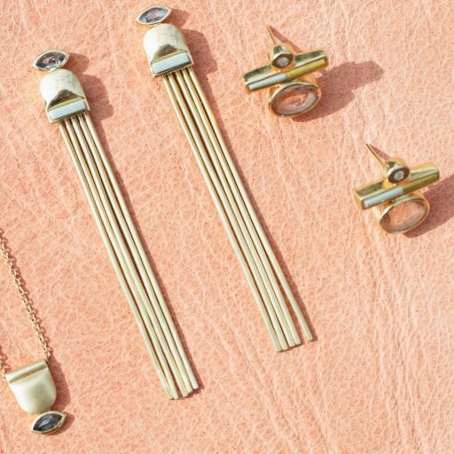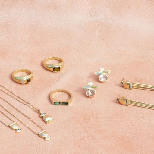he Rhea Collection celebrates the flow and fruitfulness of the earth and both the minerals and precious metals that come from it. Named after the Greek Goddess Rhea, who embodies fertility and strength, Avery Lee’s debut collection in Fairmined gold represents abundance and ease. The collection mixes Fairmined gold with ethically sourced tourmalines from Malawi and Nigiria, reclaimed white diamonds, and Jade, Jaspers, and Sunstones sourced directly from miners in the American West.