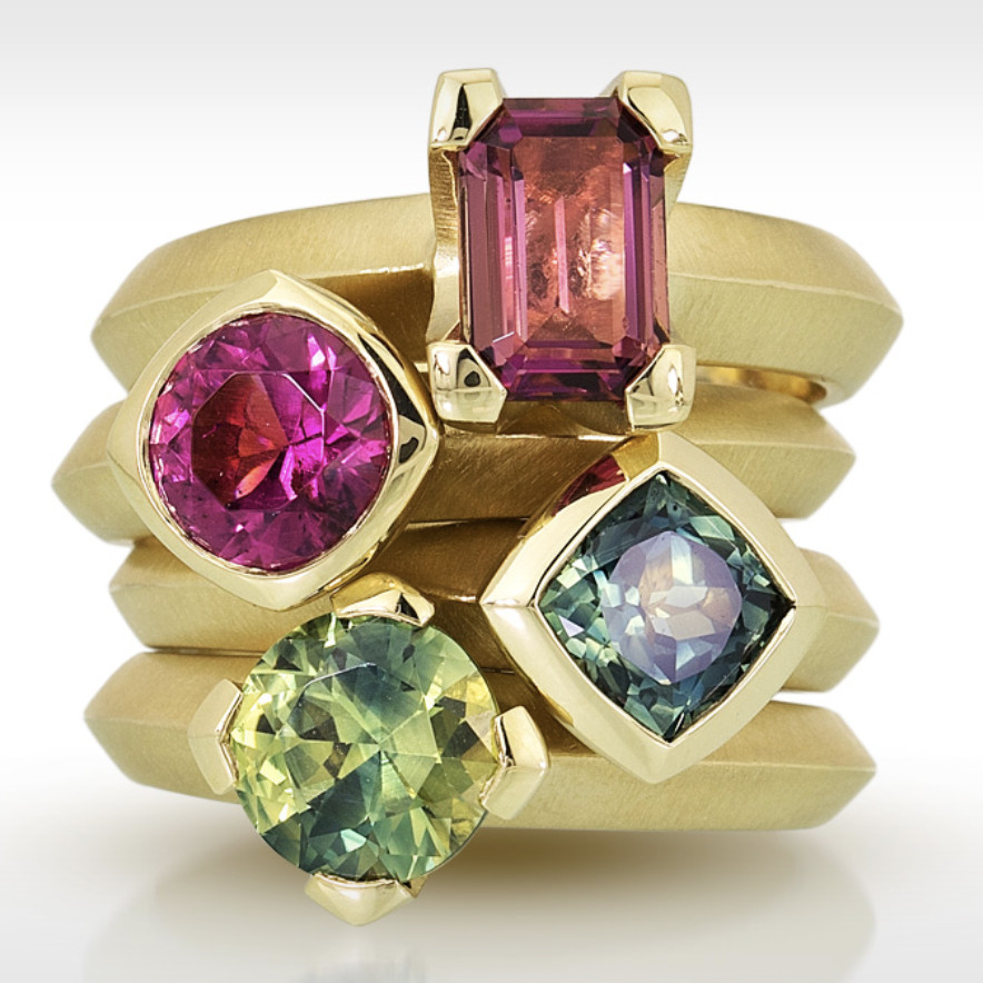18k Fairmined gold, all gems are fair trade or domestically sourced and come from Columbia Gem House. All diamonds are recycled from Hoover and Strong or White Pine Diamonds.