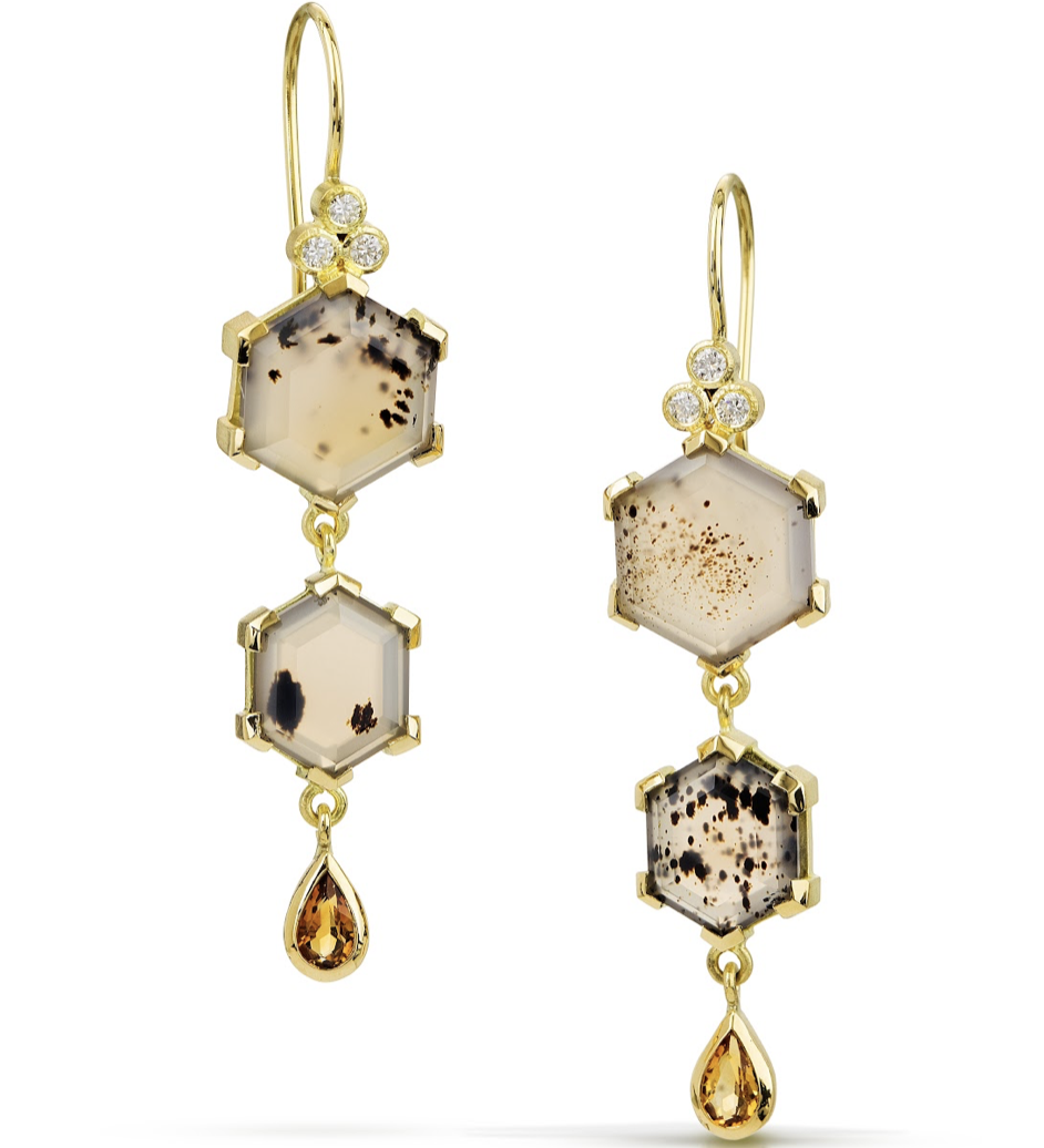 - Spotted Montana Agate and Citrine Earrings: in 18k Fairmined gold with 10x10mm and 10x8mm hexagon cut Montana agates; 5x3mm fair trade citrines, and .15 ct total weight post-consumer recycled diamonds