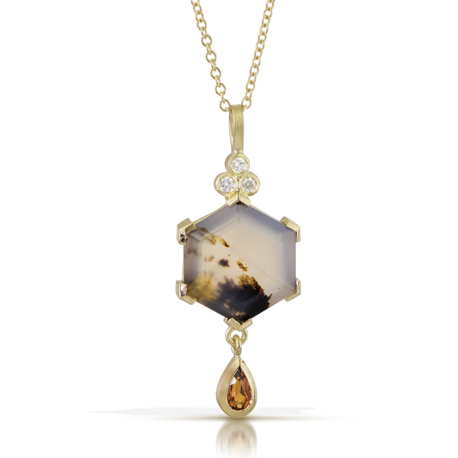 - Spotted Montana Agate and Citrine Necklace: in 18k Fairmined gold with 12x12mm hexagon cut Montana agate; 5x3mm fair trade citrine, and .075 ct total weight post-consumer recycled diamonds