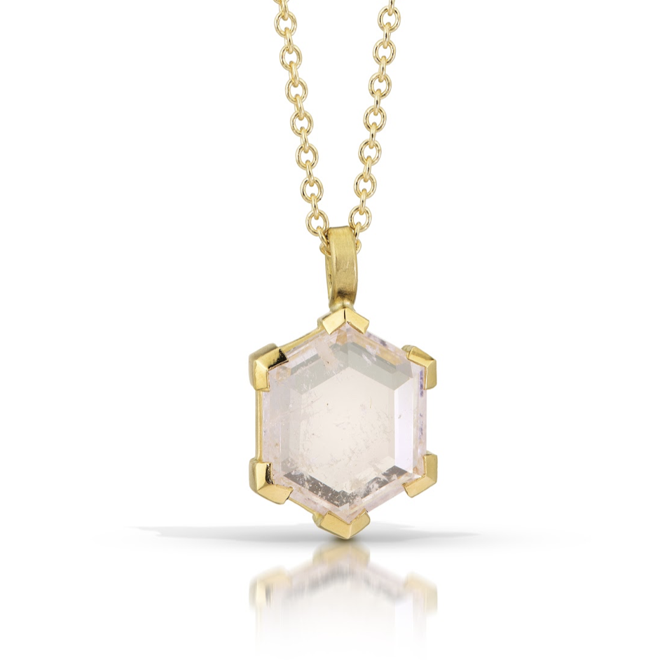 - Morganite Necklace: in 18k Fairmined gold with 10x8mm hexagon cut fair trade morganite