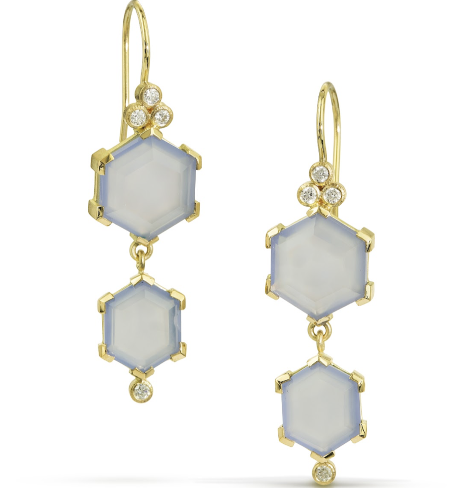 - Chalcedony Earrings: in 18k Fairmined gold with 10x10mm and 10x8mm hexagon cut fair trade Chalcedony and .20 ct total weight post-consumer recycled diamonds