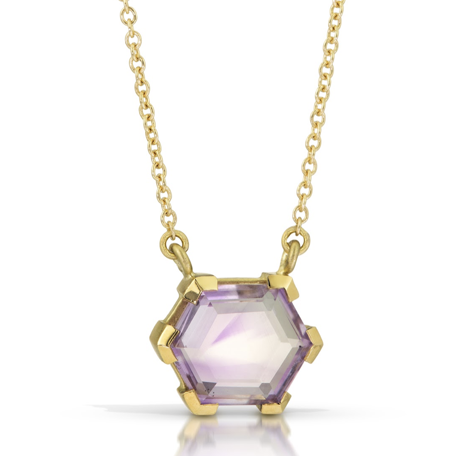 - Amethyst Necklace: in 18k Fairmined gold with 10x8mm hexagon cut Montana amethyst