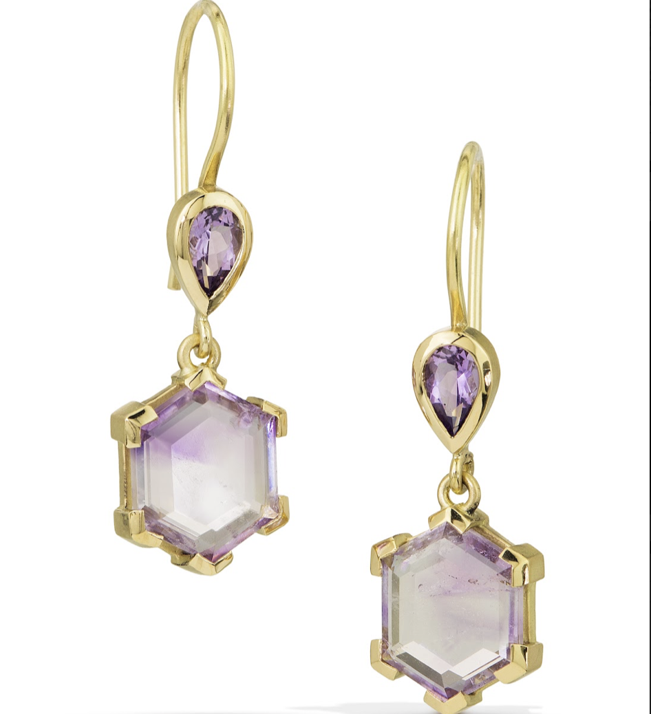 - Amethyst Earrings: in 18k Fairmined gold with 10x8mm hexagon cut Montana amethysts and 5x3mm pear cut fair trade amethysts