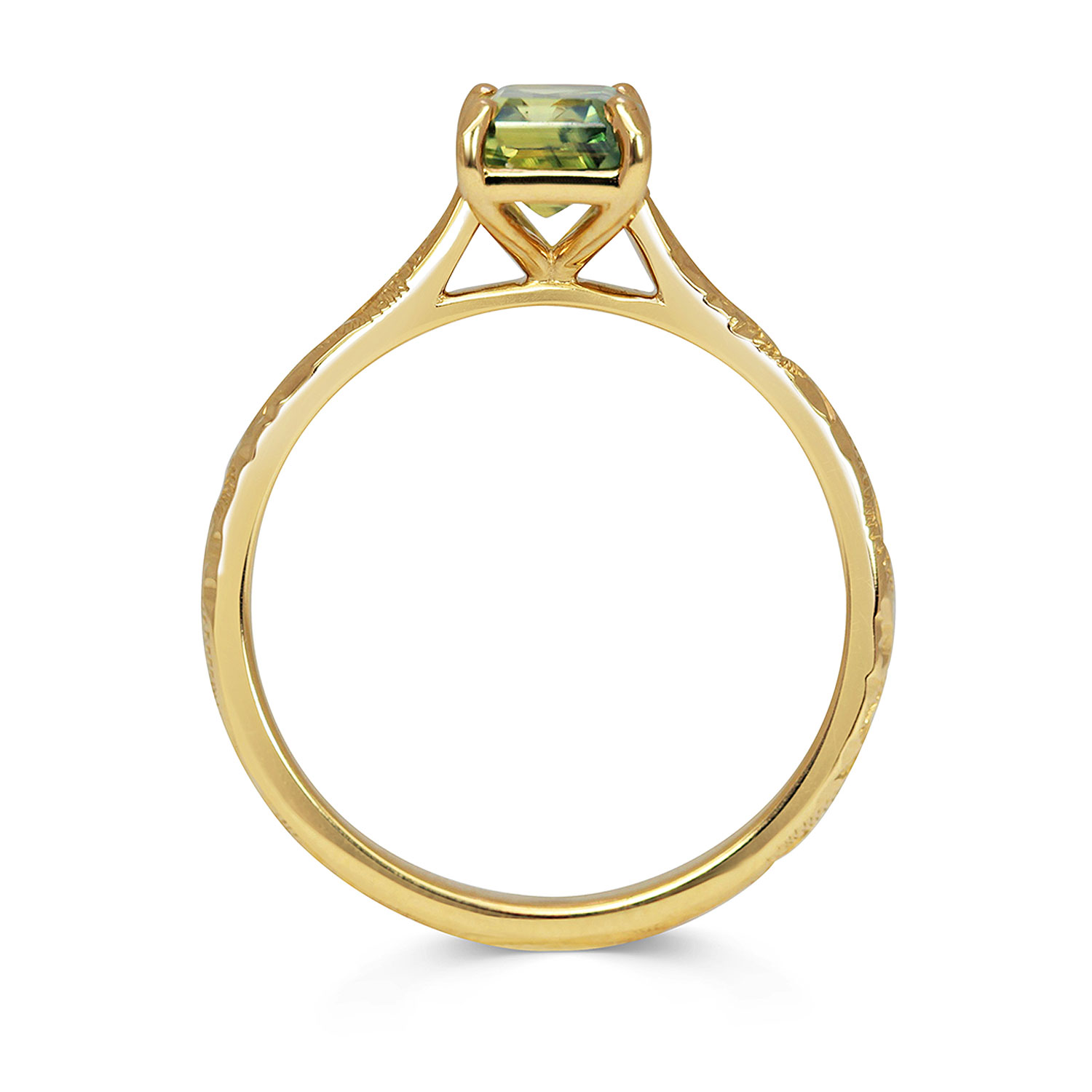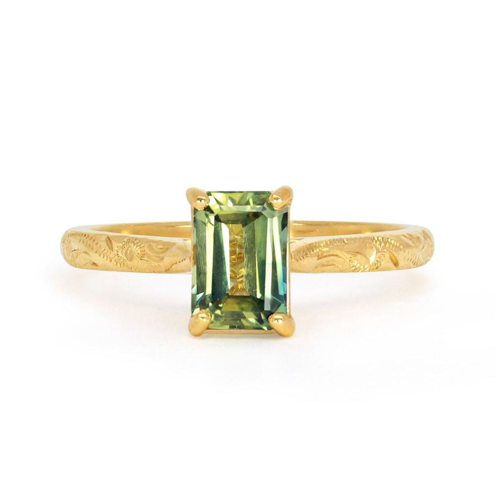 Set atop the gleaming hand-engraved band is a 1.3ct emerald-cut sapphire of traceable Australian origin, with zero ties to conflict or exploitation of any kind.