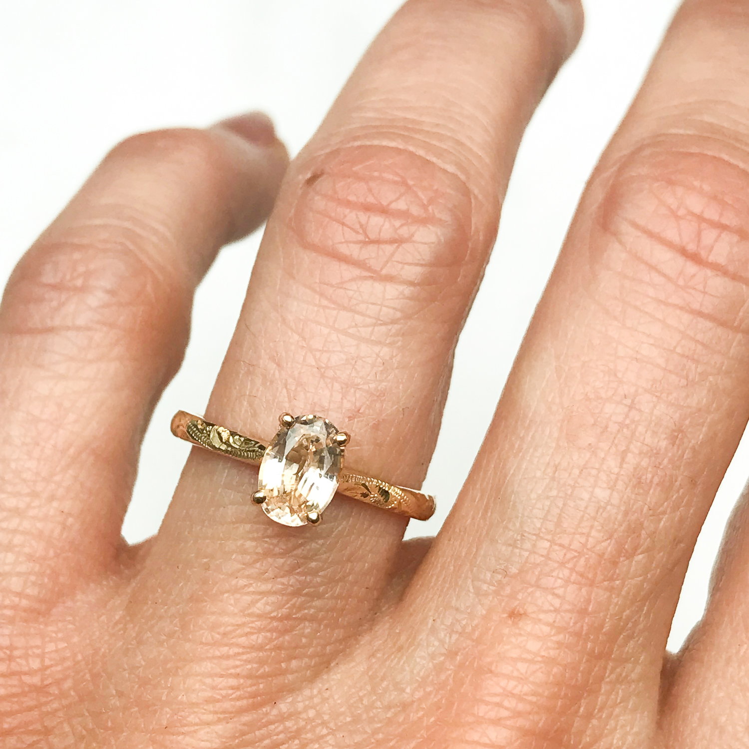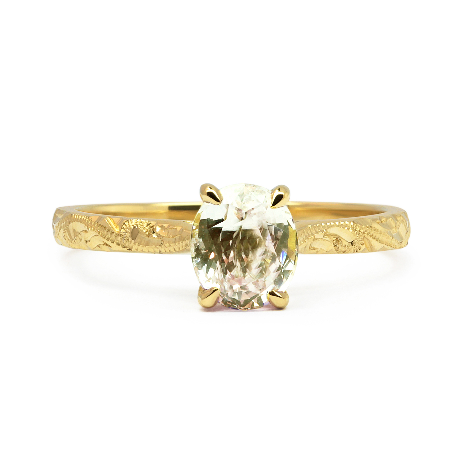Created by jewellers right here in the UK. From the florid scroll motif lovingly hand-engraved by Darren to the elevated three-claw setting created by our stone-setter Michael, it’s a celebration of traditional British craftsmanship.