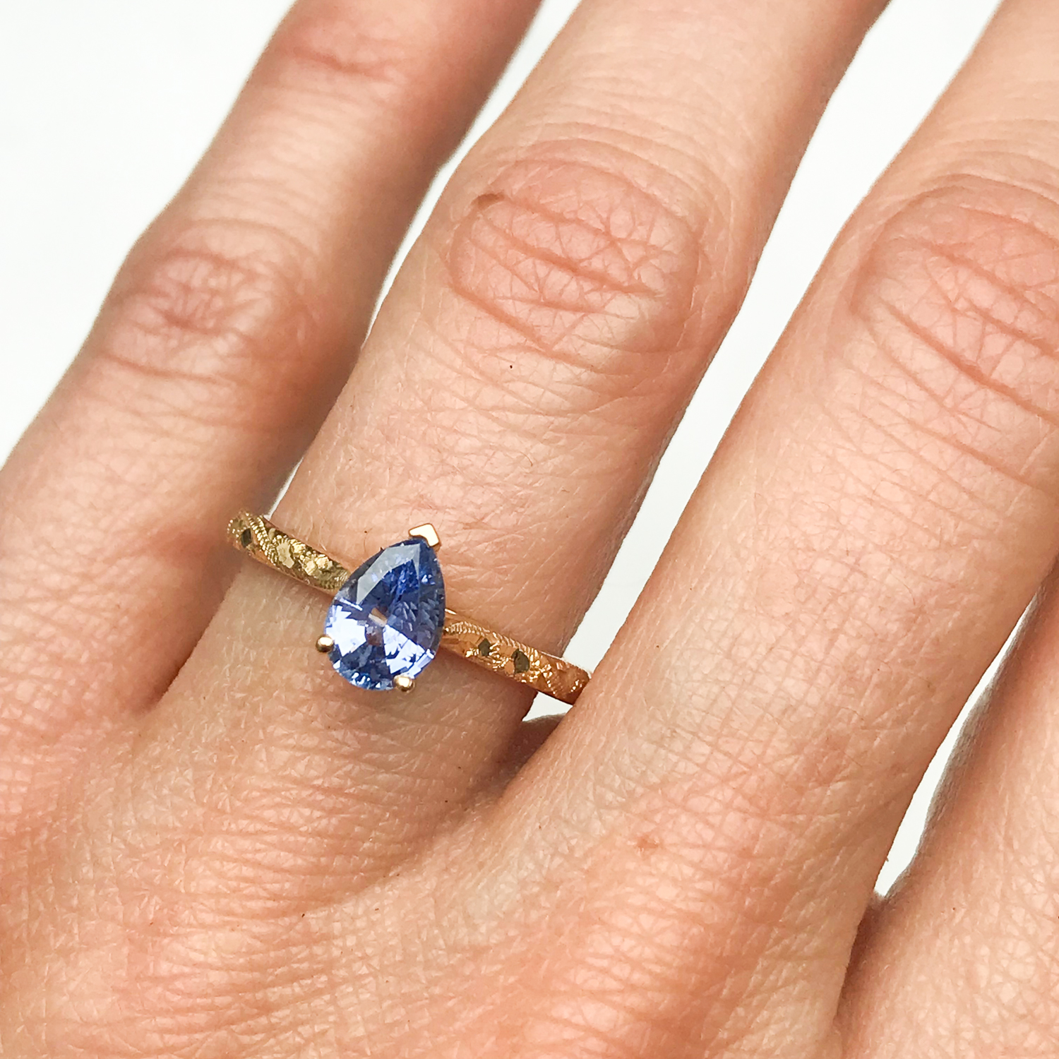 The crown jewel is a 0.79ct pear-cut blue sapphire of fair-traded Sri Lankan origin. Traceable stone is conflict-free, extracted from the ground via fair and safe labor practices, in a mine where preservation of the natural environment is prioritized.