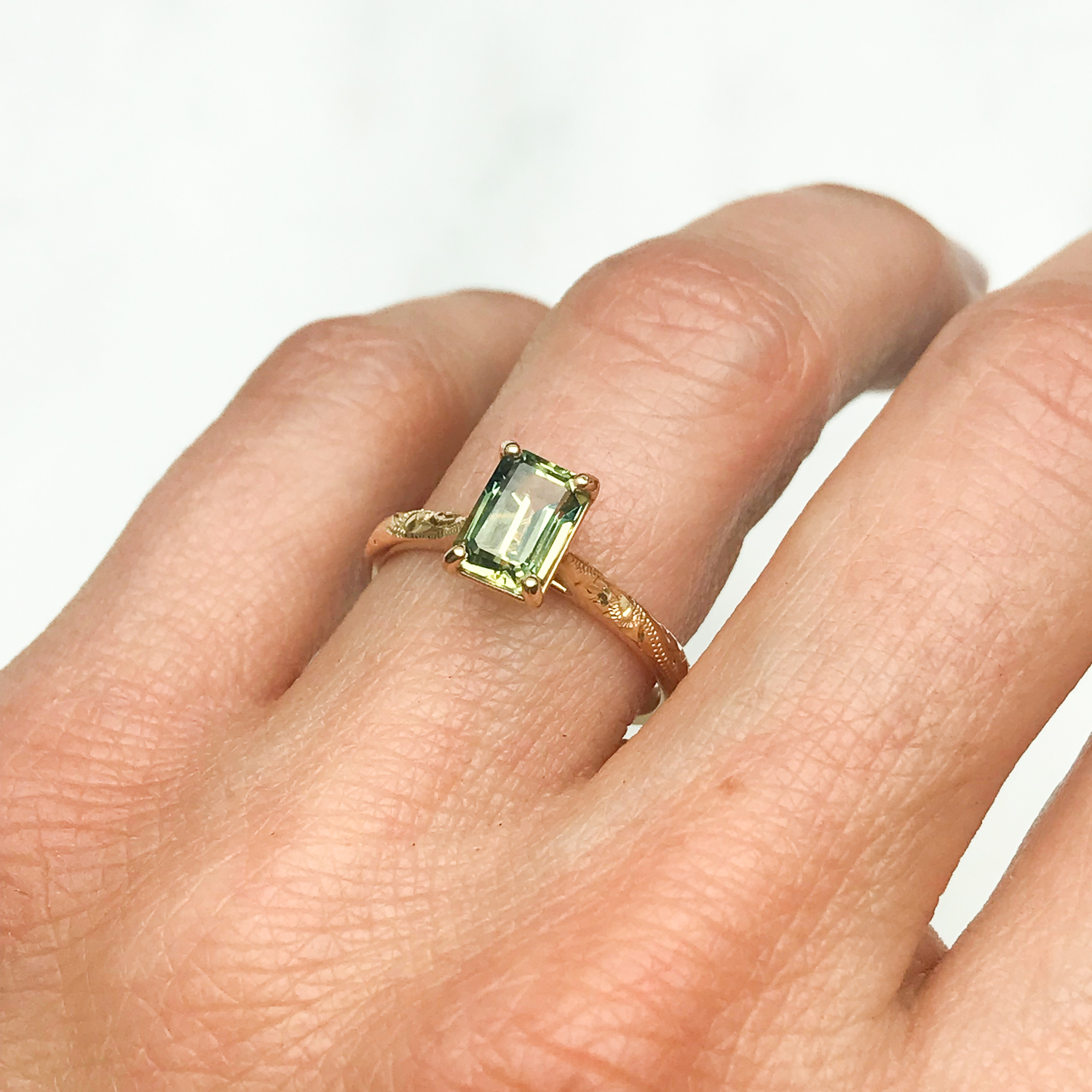 FANCY ATHENA GREEN EMERALD CUT SAPPHIRE SOLITAIRE ENGAGEMENT RING, 18CT ETHICAL GOLD