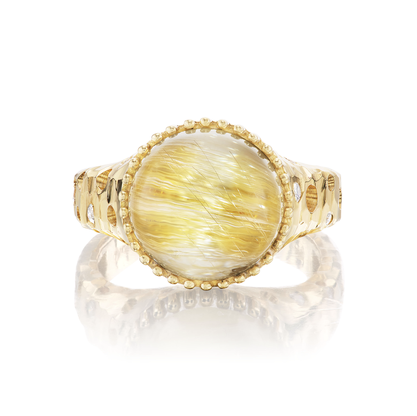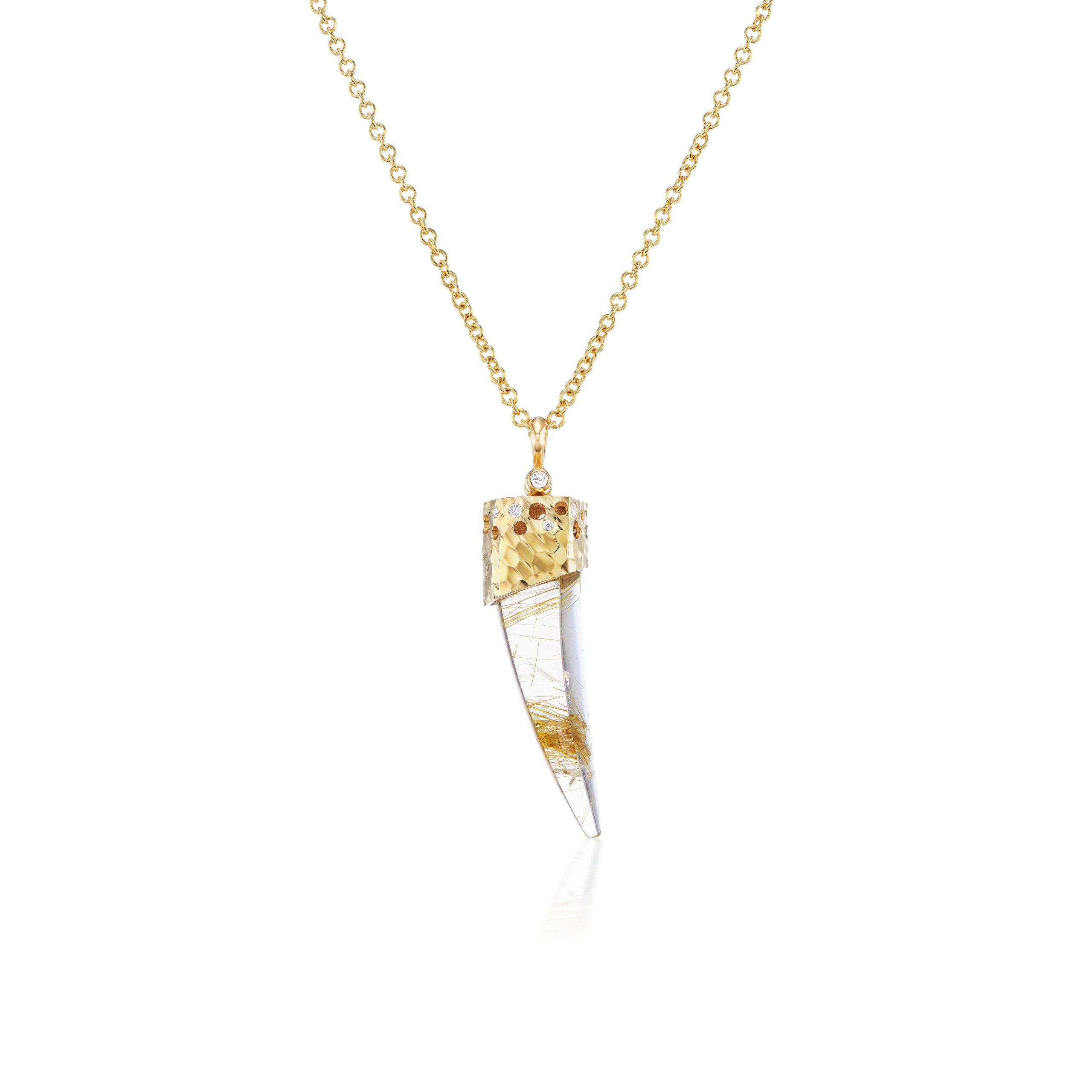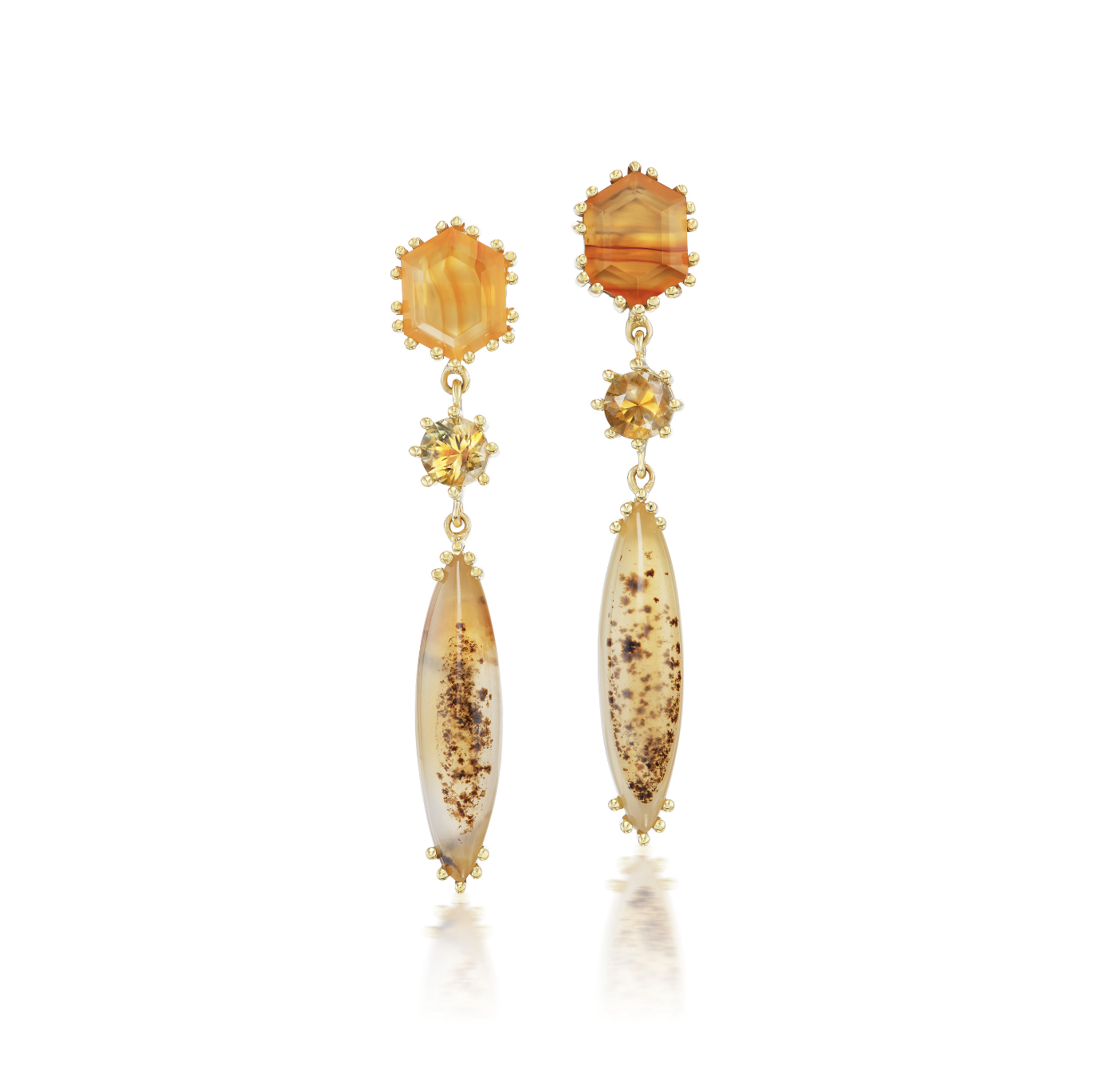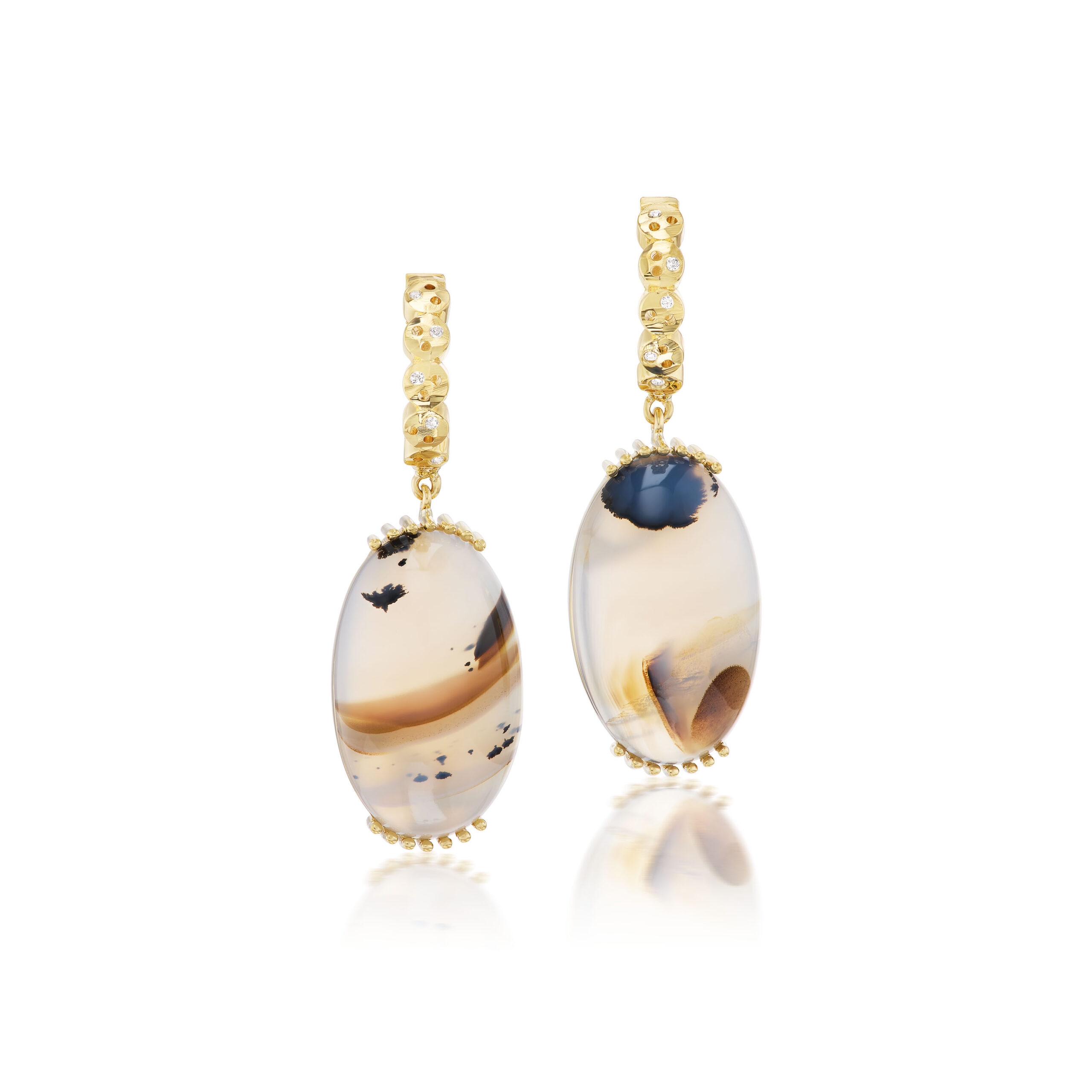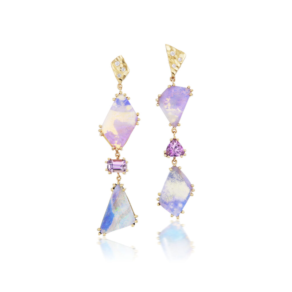 The pieces in this collection are intentionally beautiful and balanced (while not always symmetrical) yet simple in design, drawing a parallel to this obvious fact that we conversely seem distant from while on the hamster wheel of modern life. Yet the fact that we wear these pieces on our bodies reminds us of our connection to the earth, sky and sea. The inclusions, patterns and shapes present in these jewels symbolically bring their owner and wearer back to a grounded place, where we recognize our integration with nature and our duty to care for it and its inhabitants.