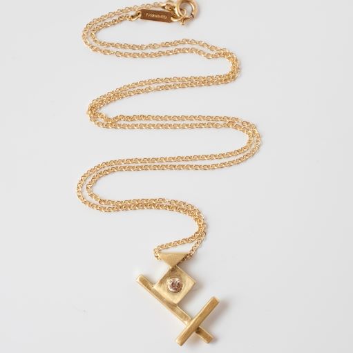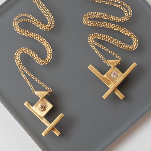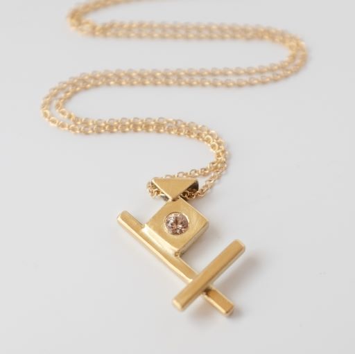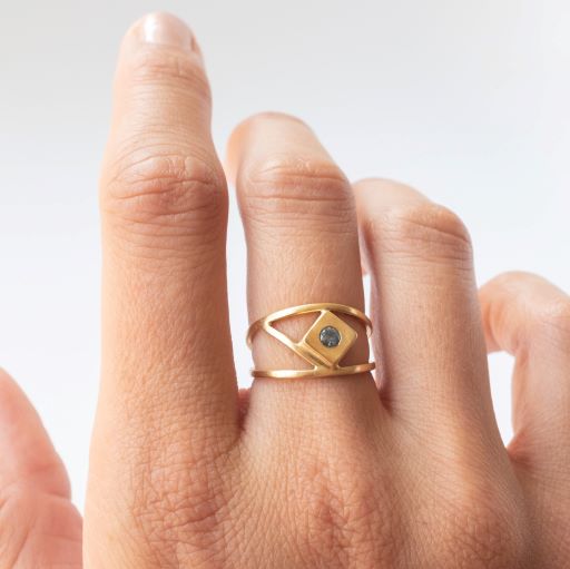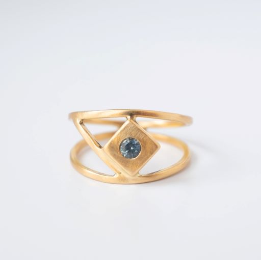 “This collection is titled “Lietuva” after my homeland of Lithuania. I drew inspiration for the designs during a recent trip there, focusing on the pagan symbolism that is commonly seen in Lithuanian folk art and various architectural details reflecting similar geometry. The current capsule collection includes a ring design and two necklace designs and I plan to add more designs to the collection in the future. All of the pieces are hand fabricated in 18k Fairmined gold (one ring of the same design, which is being donated to the Pure Earth Benefit Auction by the way, was made in 18k Fairmined Eco gold specifically) and include a flush set, 3mm Montana sapphire in colors inspired by the Baltic Sea at sunset.”