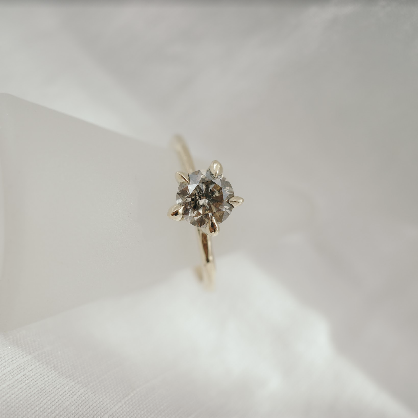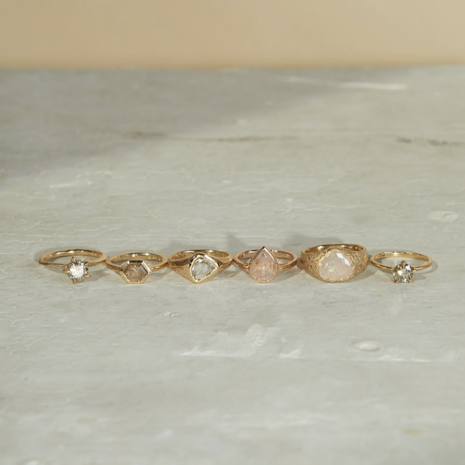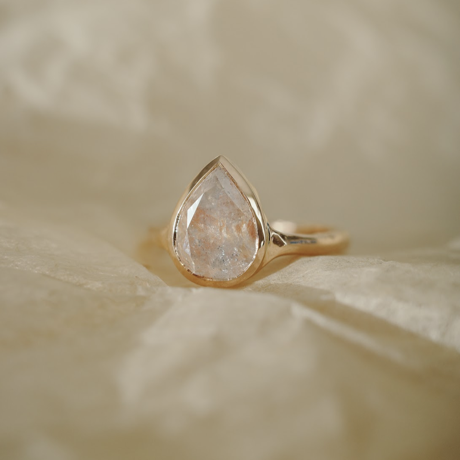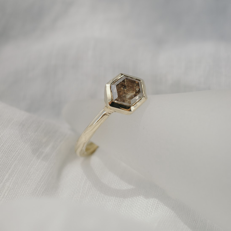 Champagne Hexagonal Diamond + Bezel Ring This solitaire showcases a remarkable champagne coloured salt + pepper diamond to excellent effect. The stone itself is a deep cognac colour that likes to shift in different lights, and looking down into it is like looking into a tiny galaxy resting in a reflective golden frame.