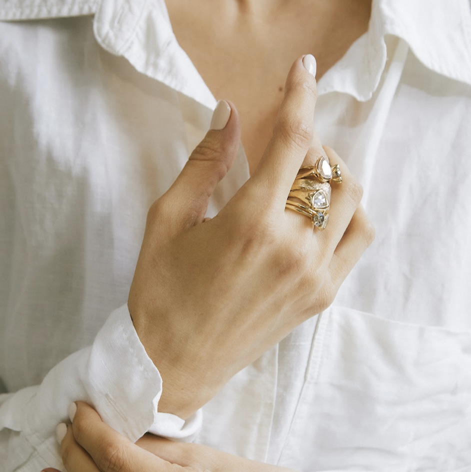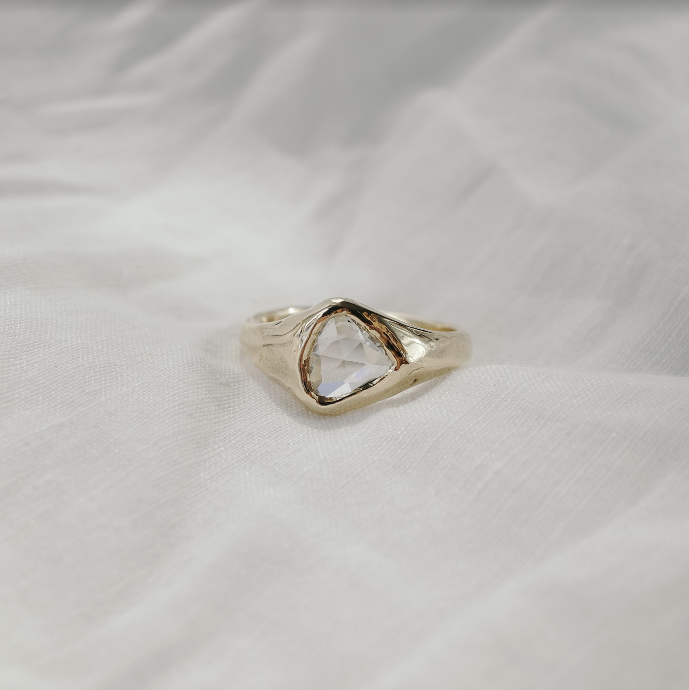 Amorphous Rose Cut Diamond Signet A lovely asymmetric rose cut white diamond sits in a sculpted golden surround. The waves of texture that rise to the central stone compliment its curving drop-shaped cut, while the facets across the face of the stone glitter with light.