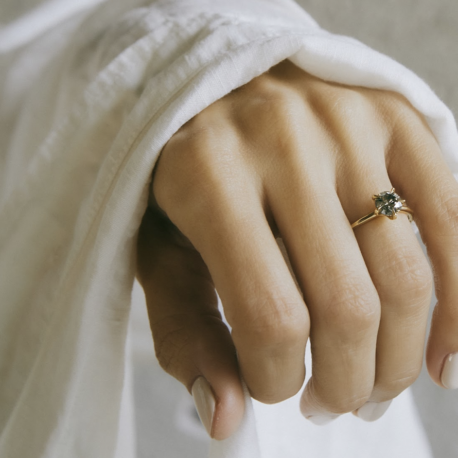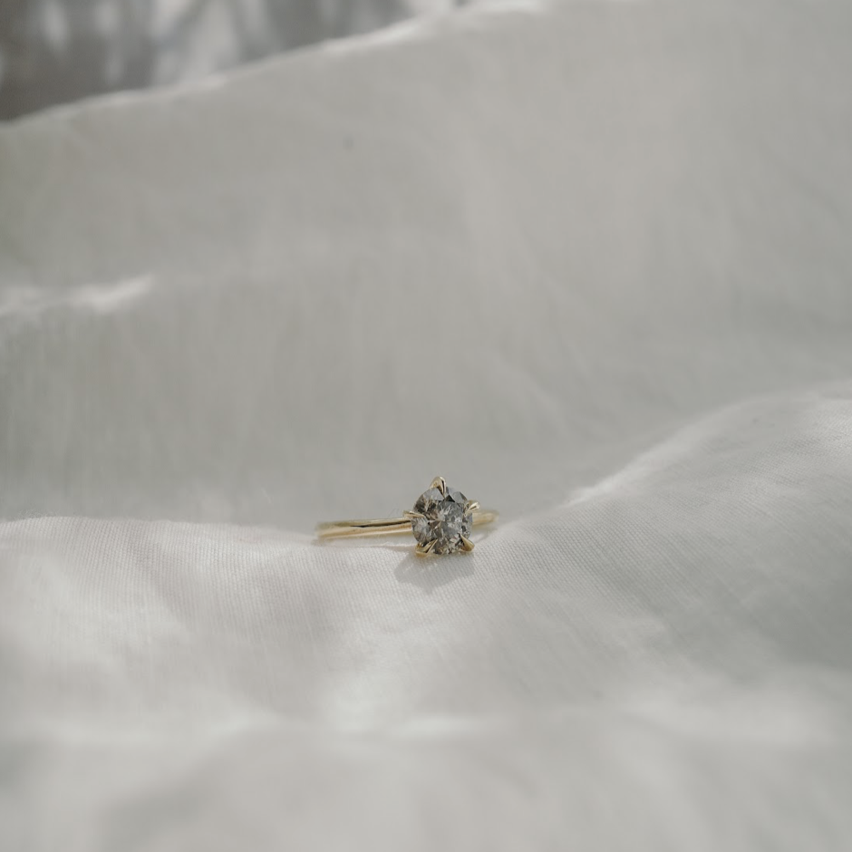 With strong sculptured shoulders branching up to 5 prongs each with their own shape and style, it showcases a sparkling 1.2 carat salt and pepper diamond with base hues including a honey gold that is set off perfectly by the mount. Classic and timeless from afar, strong and totally unique upon closer inspection.