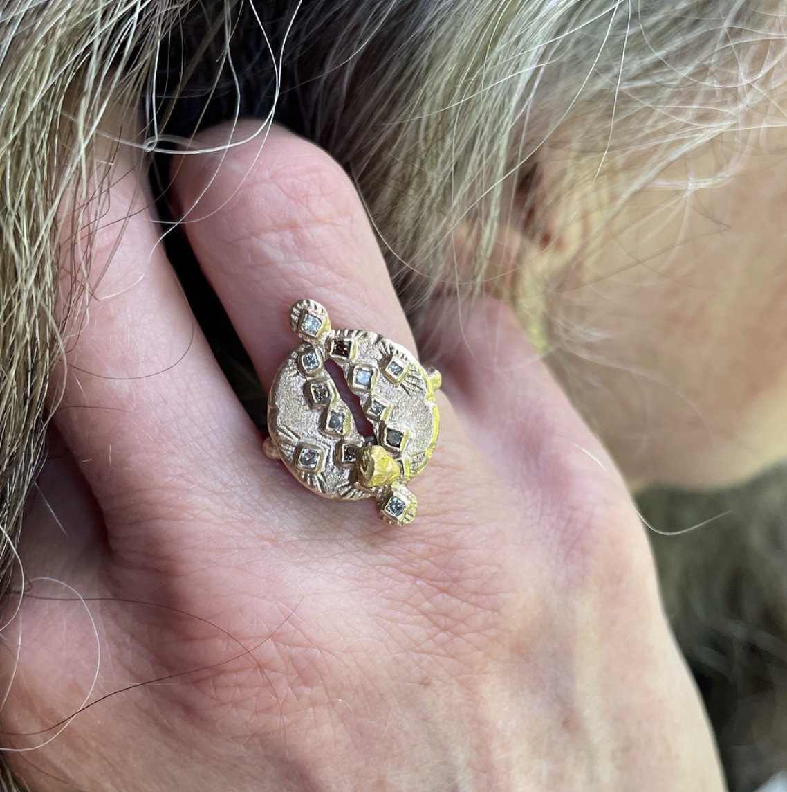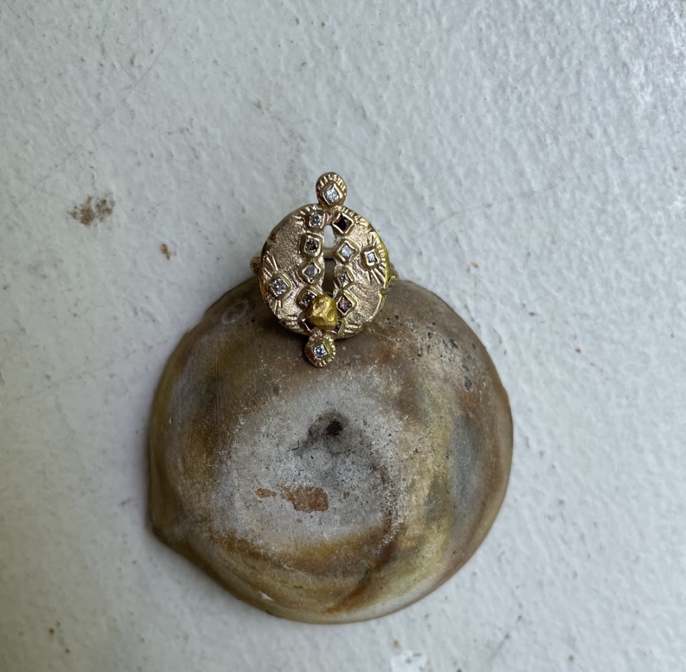 A pure 24k gold nugget moves along a path of diamonds, symbolizing the many hands through which the gold has travelled since its unearthing. Made with 100% certified Fairmined gold, this piece embodies our ethos of using materials of sustainability and traceability.